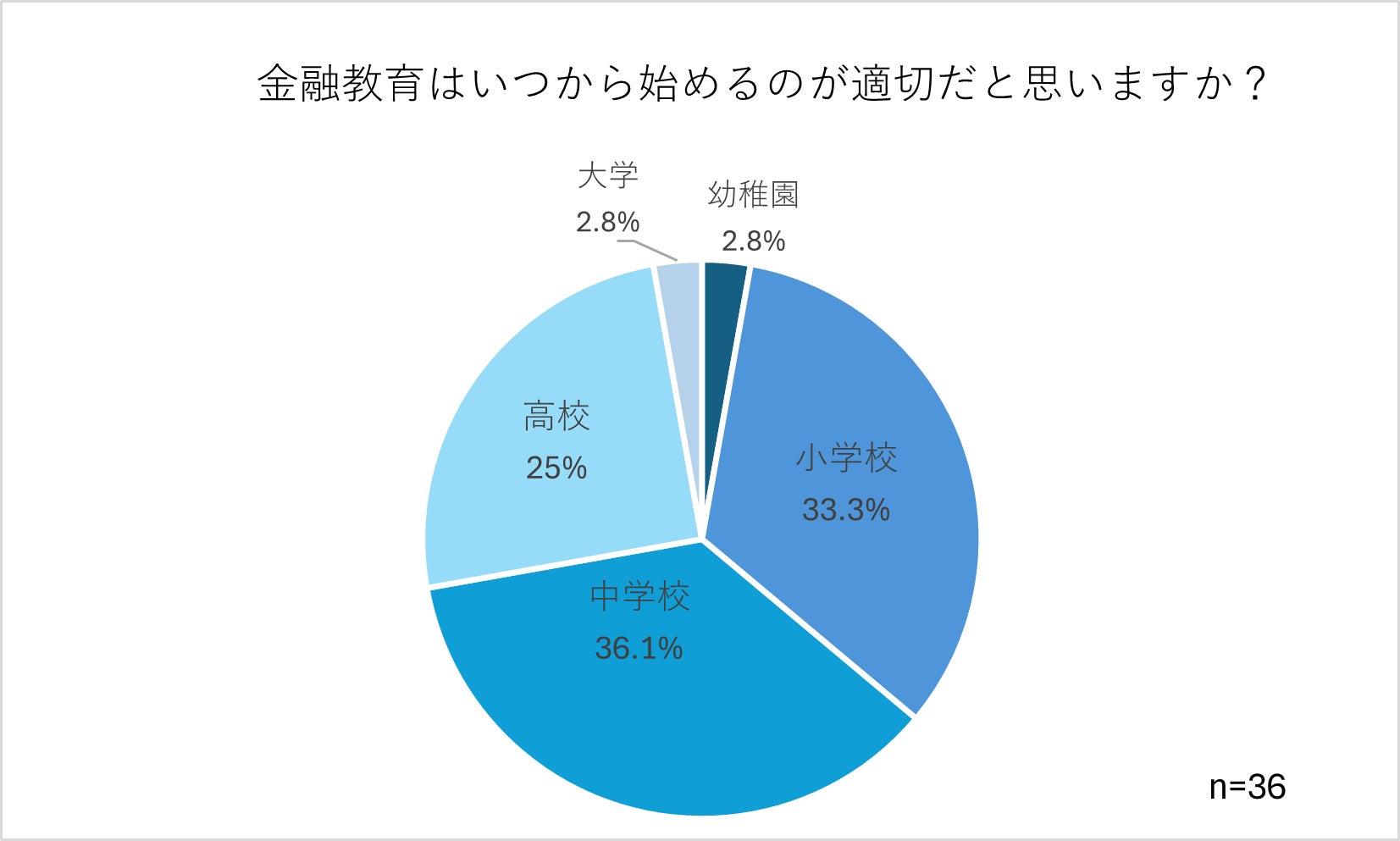 「金融教育はいつから始めるのが適切だと思いますか」と聞いたところ、小学校からが33.3%、中学校からが36.1%、高校からが25%と回答が集まりました。