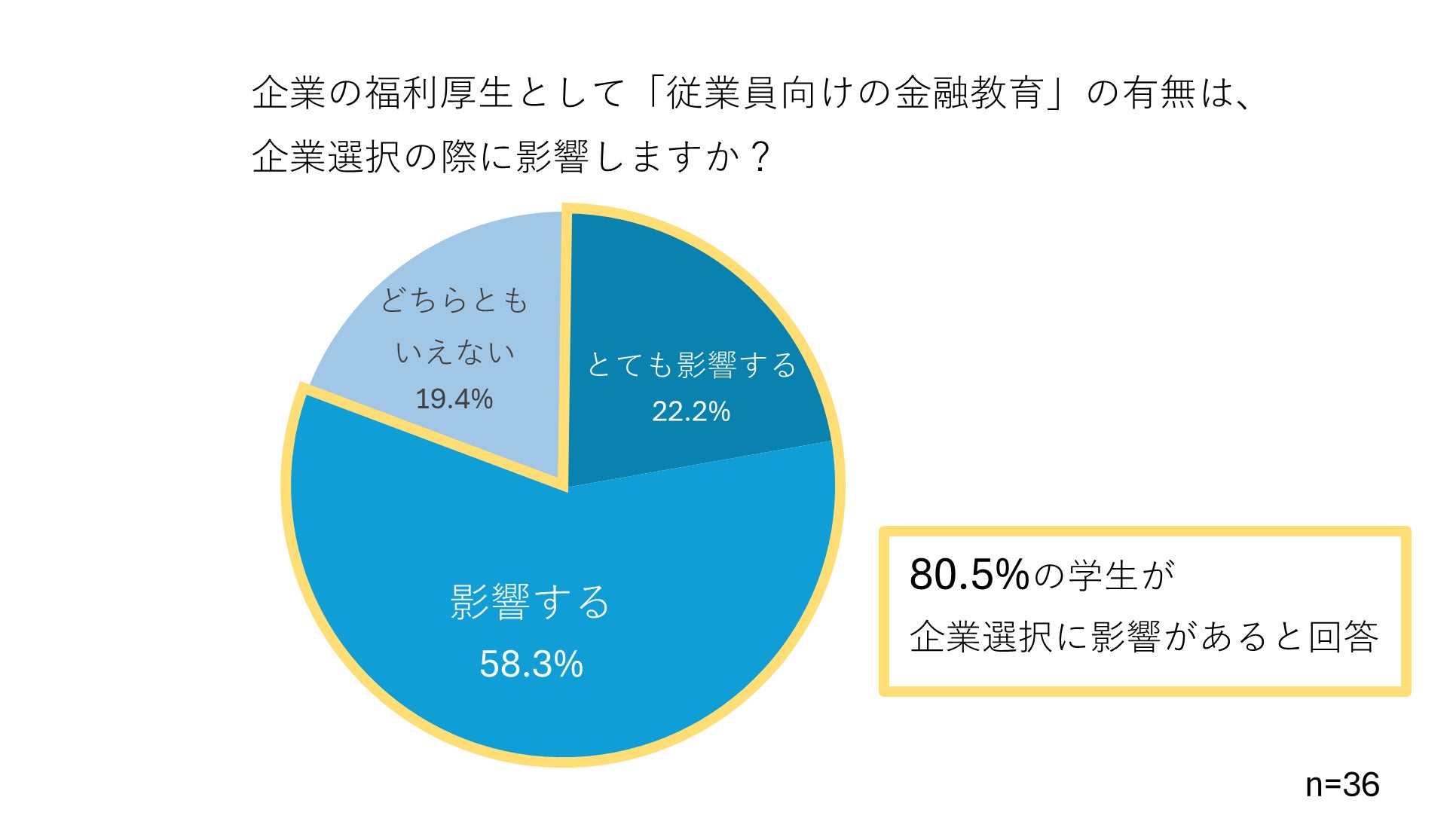 「企業の福利厚生として「従業員向けの金融教育」の有無は、企業選択の際に影響しますか?」と聞いたところ、「とても影響する」が22.2%、「影響する」が58.3%、「どちらともいえない」が19.4%と、約8割の学生が従業員向け金融教育の有無で企業選択に影響があると回答しました。