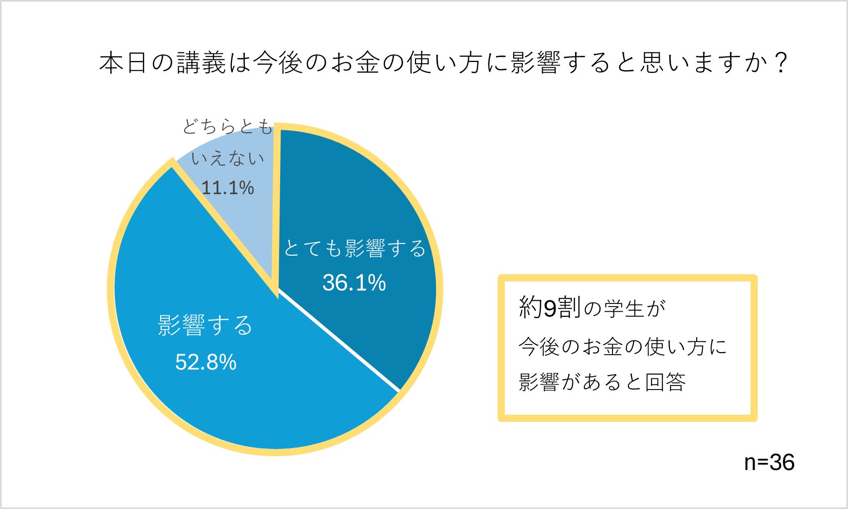 「本日の講義は今後のお金の使い方に影響すると思いますか?」と聞いたところ、「とても影響する」が36.1%、「影響する」が52.8%、「どちらともいえない」が11.1%でした。約9割の学生は、今回の講義が今後のお金の使い方に影響があると回答しました。