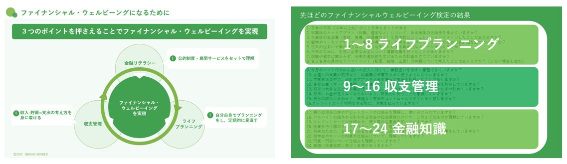 「金融の力を解き放つ」をパーパスに掲げ、保険・証券・住宅ローンと複数の金融商品を横断して1社で取り扱い、人々のライフプラン実現をサポートするブロードマインド株式会社(本社:東京都渋谷区、代表取締役社長:伊藤清、証券コード:7343、以下「当社」)は、2024年10月3日に関西大学商学部の学生を対象にファイナンシャル・ウェルビーイング(以下、「FWB」)についての講義を実施しました。