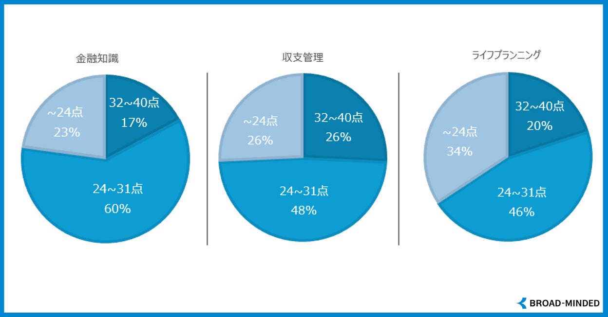 金融知識・収支管理・ライフプランニングの3つの分野についてそれぞれ8問ずつ質問が用意されており、計24問の質問に回答することでお金に関する健康状態(ファイナンシャル・ウェルビーイング度合い)をセルフチェックします。(各分野40点満点)