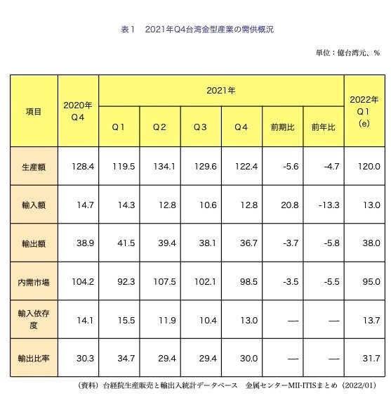台湾金型産業の2021年第4四半期の生産額は122億4,000万台湾元で前期比5.6%減、前年同期比4.7%減だった。内需規模は98億5,000万台湾元で前期比3.5%減、前年同期比5.5%減、輸入額は12億8,000万台湾元で前期比20.8%増、前年同期比13.3%減、輸出額は36億7,000万台湾元で前期比3.7%減、前期同期比5.8%減だった。