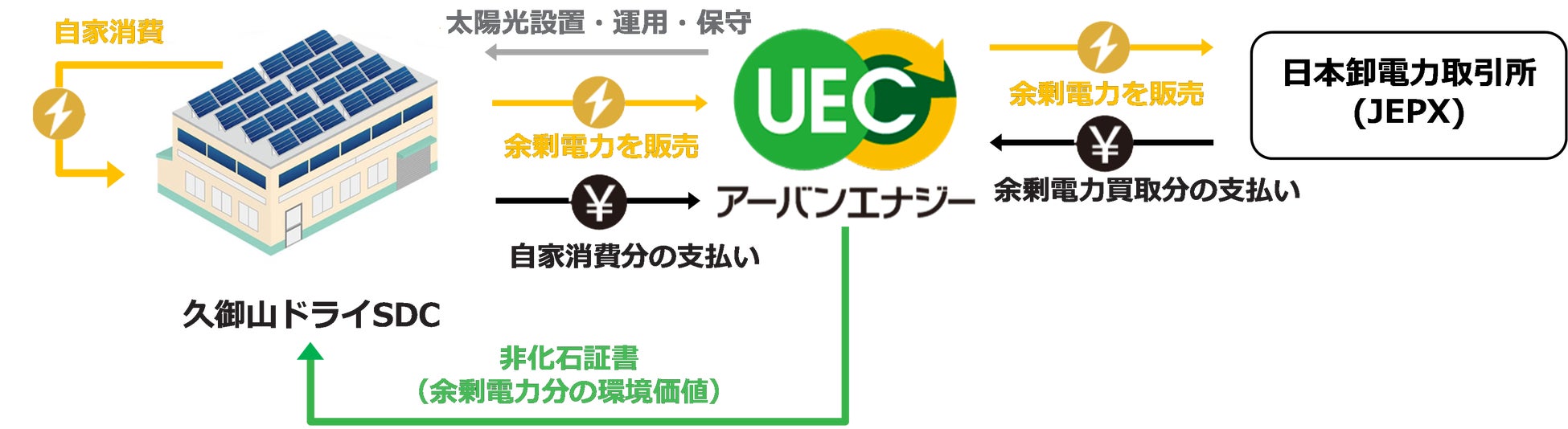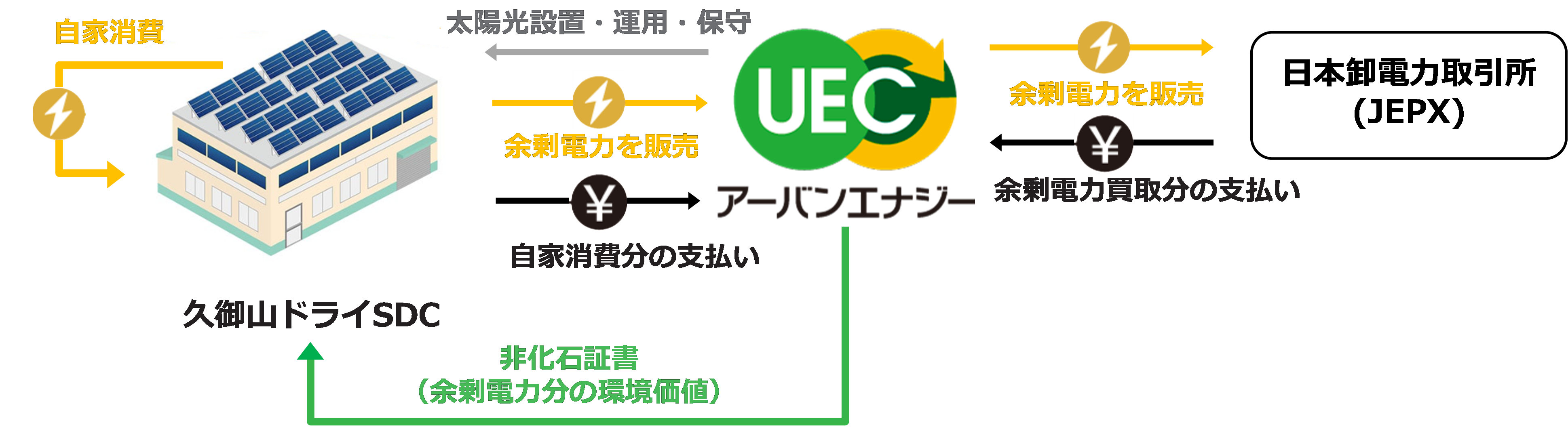 本サービスは、アーバンエナジーが三菱食品・久御山ドライSDCの屋根全面に太陽光発電設備を設置し、発電した電力のうち、同物流センターの使用電力量分を三菱食品が自家消費します。さらに使用電力を上回った余剰分の電力はアーバンエナジーが市場で販売し、その環境価値を非化石証書として三菱食品に還元することにより、久御山ドライSDCだけでなく、三菱食品およびステークホルダー様のCO₂排出量削減の取り組みに貢献することができます。