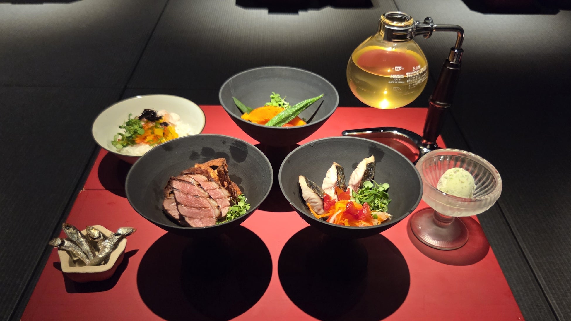 ◾️メニュー barrierでは、三方(さんぼう)をお膳として利用し、岡持ち(おかもち)に収められた三つのお椀料理に、サイフォンで抽出された一番出汁を注ぎます。 これにより、一杯のお出汁がお客様の食体験に奥深さと芳醇さを加えます。 barrierは、伝統的な日本料理のエッセンスを守りつつも、現代的なアプローチで新たな魅力を引き出すことを目指しています。 漆黒の空間で五感を研ぎ澄ませて、出汁に合う料理をお楽しみください。