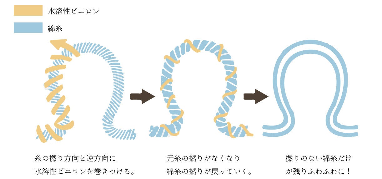 解撚糸には空気がたっぷりと含まれているので水分が糸の間に入り込み、しっかり吸水します!