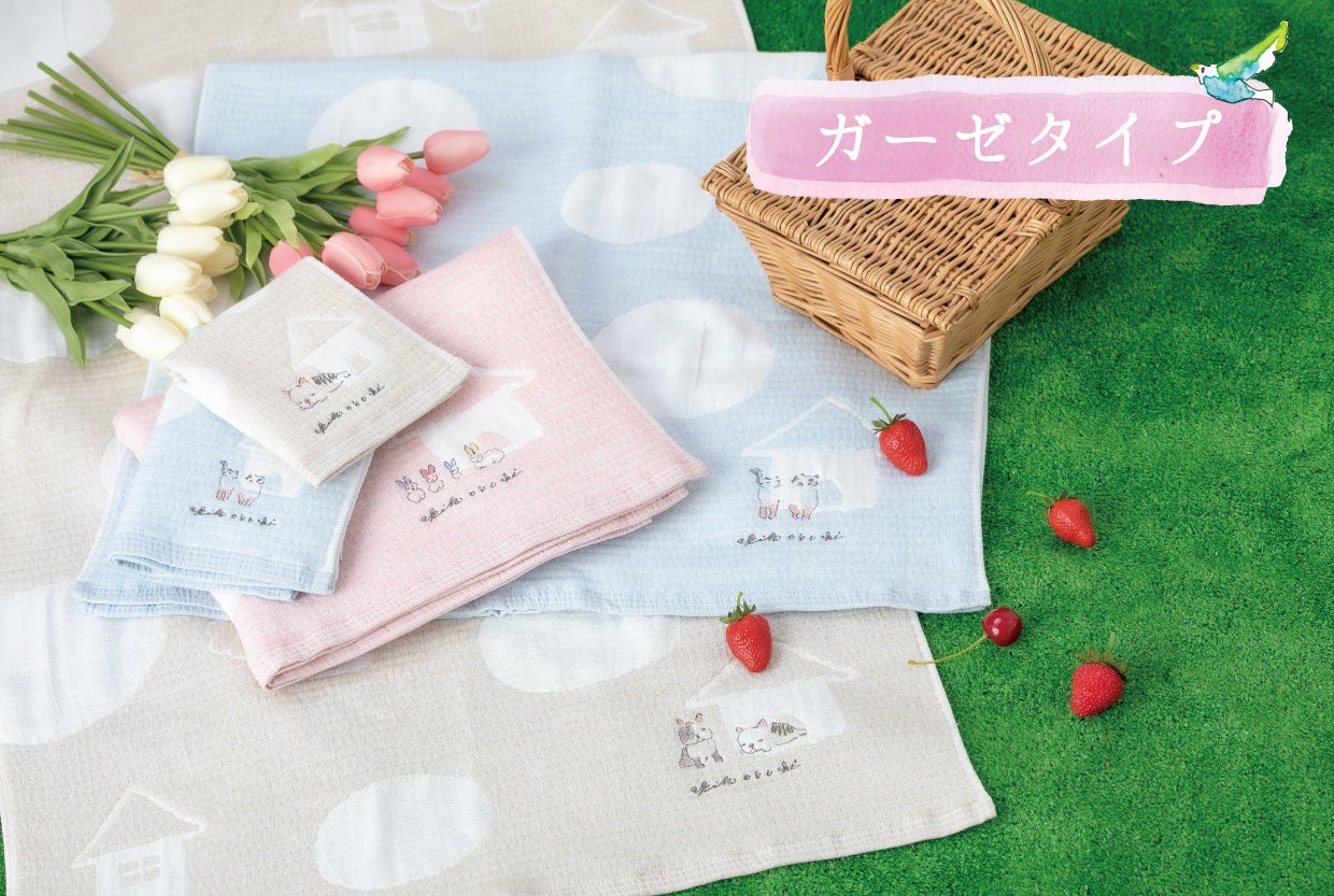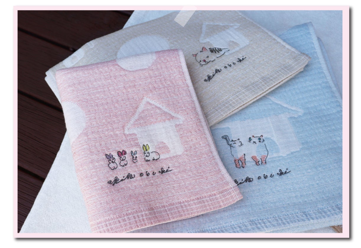 76年間タオルを追求し続けた(株)成願と、やさしさあふれるイラストが特徴のオブチアキコさんとのコラボレーションしたタオルが誕生!素材の良いタオル に 水彩タッチ のデザインがマッチ!