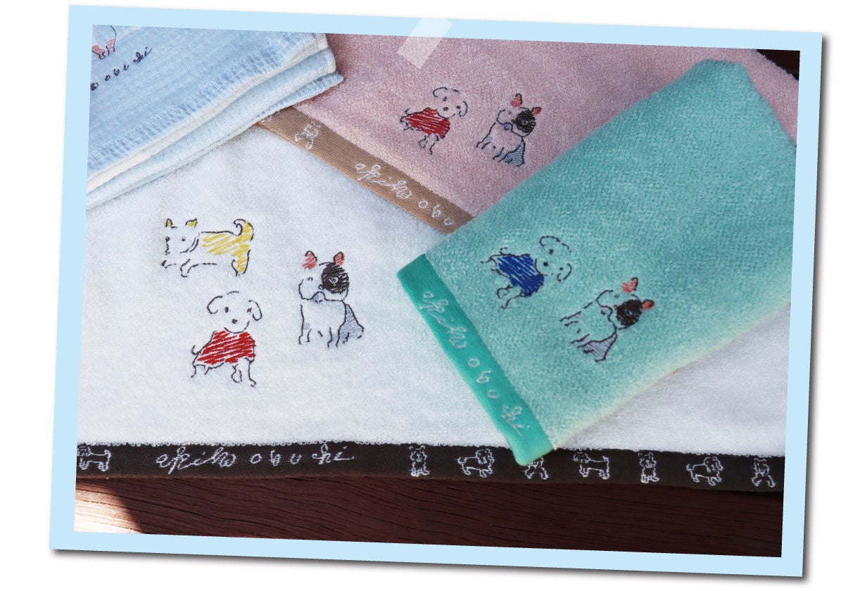 パイルタイプはしっかり吸水しふわっとボリューム感があるのが魅力です。通常の糸ではなく、今回のタオルにはオブチアキコさんのやさしさを表現するため「解燃糸」を使用し、ふっくらと仕上げました。犬のモチーフがとてもかわいく愛着が湧く一枚へ。