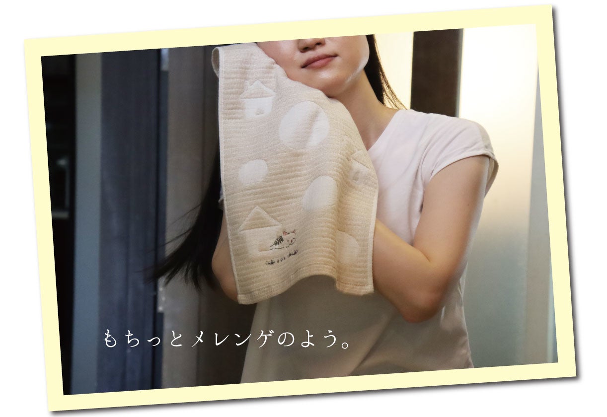 4重ガーゼで空気をたっぷり織りこみ、ふんわり。肌にあたる面はコットン100%で、中層はたっぷりと空気をふくむので、しっかり吸水し、柔らかく仕上げました。