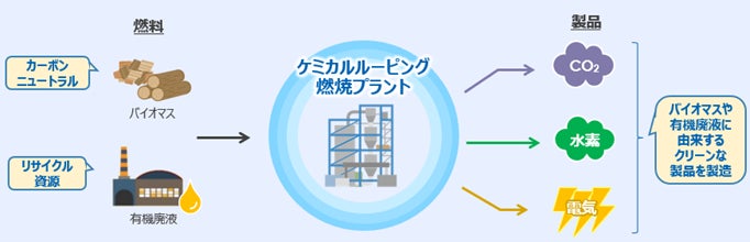 本事業は、ケミカルルーピング燃焼技術を用いてバイオマスや有機廃液などから水素・電力・CO2(二酸化炭素)を同時に製造するプロセスの実証試験に、大阪ガスと共同で取り組むものです。なお、バイオマスに代表される固体燃料を直接反応器に投入し、電力・水素・CO2を同時に製造するプロセスの実証試験は世界初[※2]の取り組みとなります。