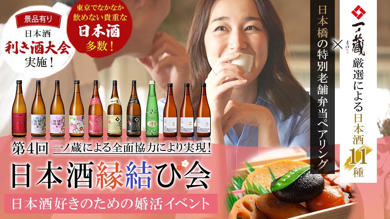 日本酒好きの独身者のための婚活イベントにて、一ノ蔵の日本酒ラインナップ11種類を取り揃えます。また、日本酒に合う肴として、日本橋の老舗弁当企業 日本橋弁松総本店 様による、日本酒縁結び会のためだけに作られた特製弁当をご用意。