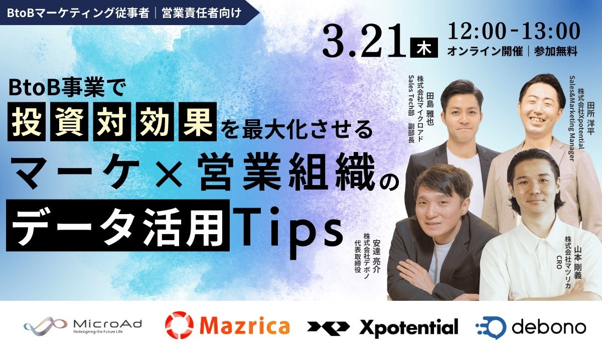 株式会社マイクロアド(本社:東京都渋谷区、代表取締役社長:渡辺健太郎、以下 マイクロアド)は、企業のBtoBマーケティング担当者や営業責任者に対し、株式会社マツリカ、株式会社Xpotential、株式会社デボノとともにオンラインセミナーを開催いたします。