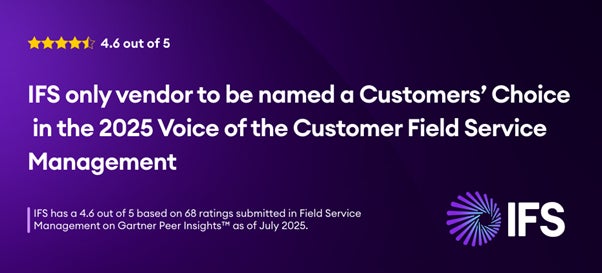 2026年1月13日、英国ロンドン — 産業用AIソフトウェアのリーディングプロバイダーであるIFSは、2025年版「Gartner® Peer Insights™ フィールドサービス管理のVoice of the Customer」レポートにおいて、Customers’ Choiceに選出されました。本レポートで選出されたベンダーはIFSのみです。