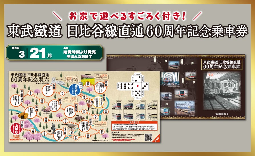 この記念乗車券は、台紙がすごろくとなっており、直通運転開始当時の駅名を再現したマスに、日比谷線 直通車として運行してきた車両をコマにしてお楽しみいただける、大変珍しい記念乗車券となっています。さらに購入特典として、付属の引換券を切り取って土休日のTHライナーにご乗車いただくと、東武線区間の車内にて「オリジナル電車カード」をプレゼントします。お子様から大人の方までお楽しみいただける内容となっていますので、ぜひこの機会に記念乗車券を お買い求めいただき、ご家族やご友人と一緒にお楽しみください。