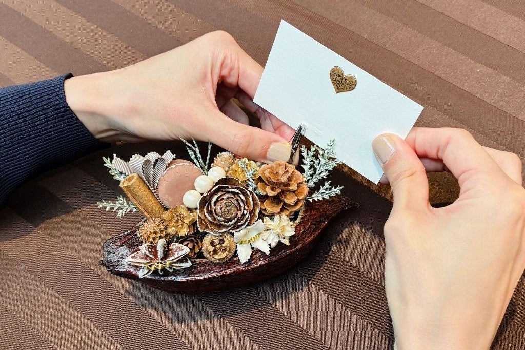 カカオポッドクラフトでは、ワイヤーを掛けたデコレーション用の木の実やスパイス、リボンなどをアレンジして、カカオポッドを装飾していきます。木の実のアレンジの基本的な方法をお伝えしますので、クラフト初心者のお客さまも安心してご参加いただける内容となっております。お好みでメモクリップを組み込むことができますので、バレンタインらしいメッセージを込めたカードやお気に入りの写真などを飾ることもできます。カカオポッドクラフトが完成した後は、会場内にご用意したブースでフォト撮影も可能です。日々を頑張るご自身へのご褒美にも、大切な人へのプレゼントにもぴったりの、世界にひとつだけのカカオポッドクラフトをお楽しみいただけます。