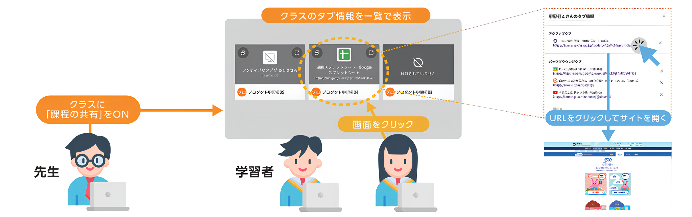 学習者同士がどのようなサイトを閲覧しているかをブラウザ情報で参照できます。学びの過程を共有することで「個別最適な学び」・「協働的な学び」をサポートします。