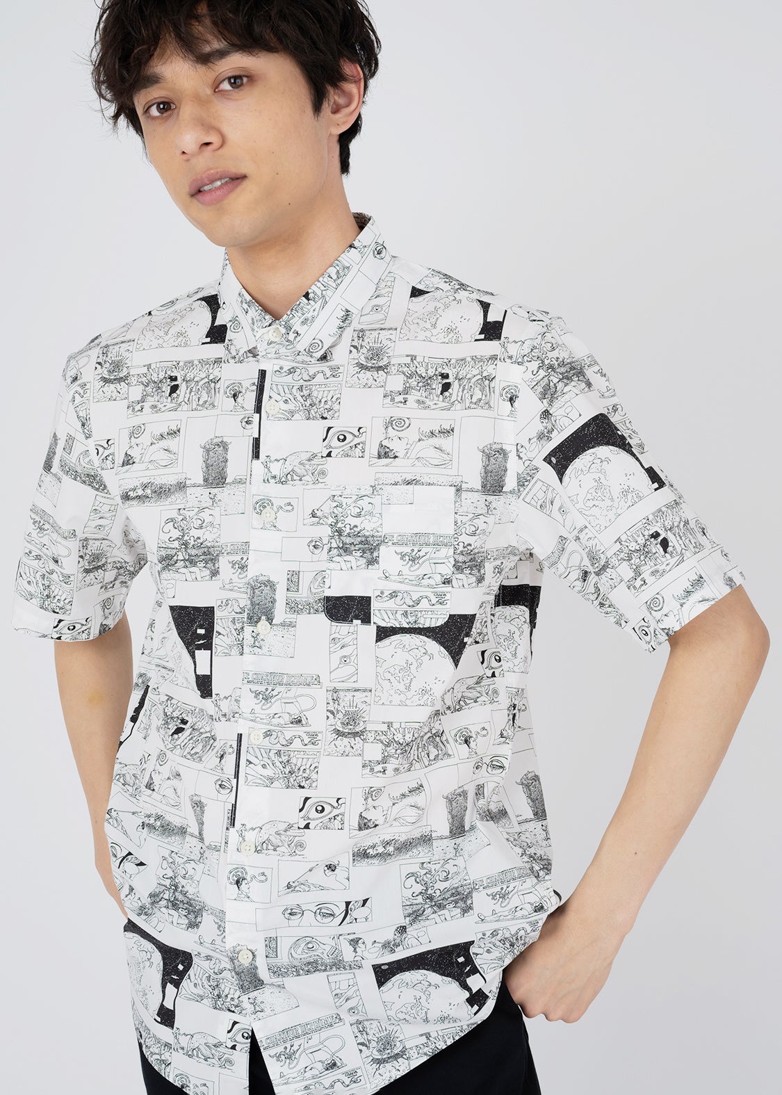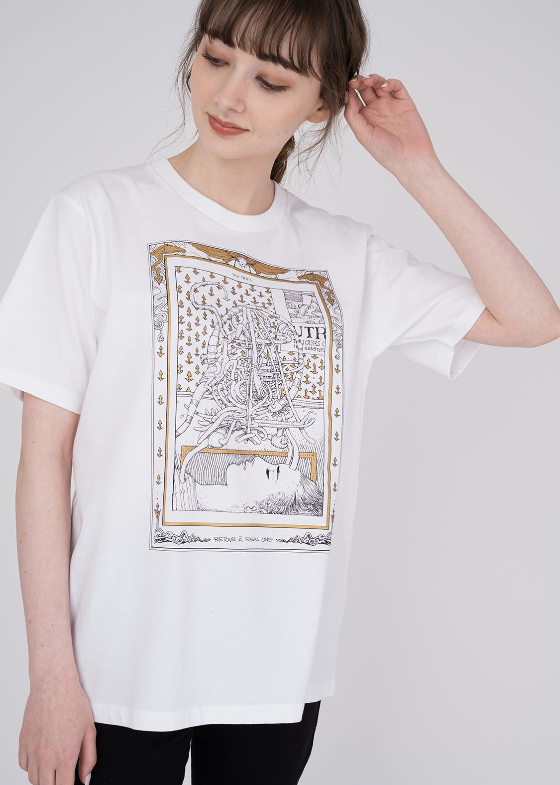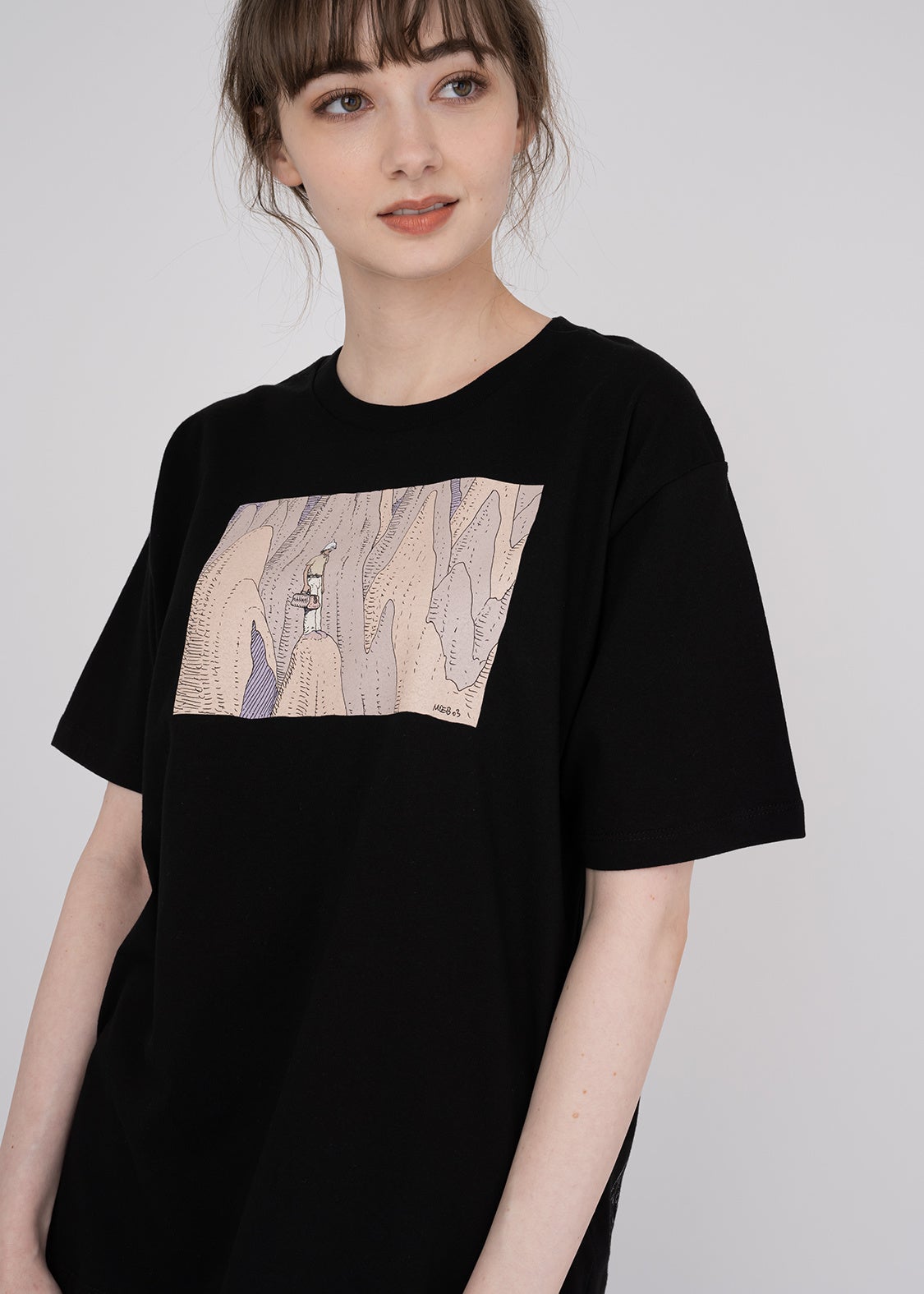 イラストをより精細に表現するため、プリント部分に別生地を使用した半袖Tシャツ。少し長めの後ろ身頃やドロップショルダーなど、ルーズなシルエットに仕上がっています。