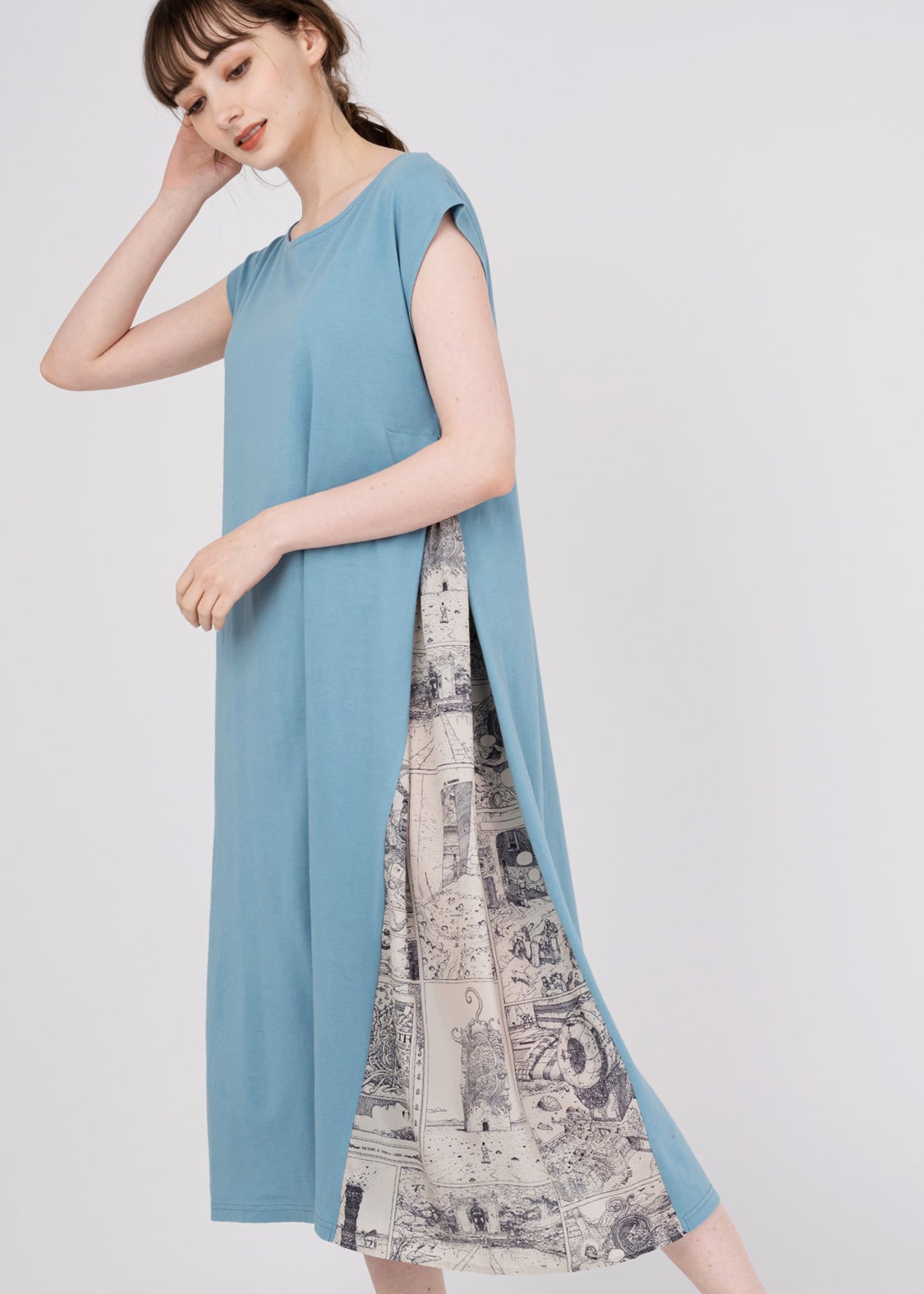サイドのプリーツ部分にプリントされた総柄が見え隠れする、動きのあるデザインワンピース。