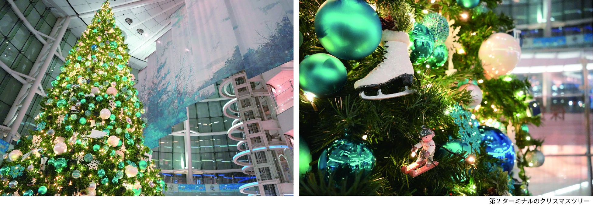 第1ターミナルは「スイーツ」をテーマに、クリスマスクッキーやジンジャーブレッドなどのお菓子のオーナメントで彩られ、第2ターミナルは「ウィンタースポーツ」をテーマに、スケートやスノーボードなどのオーナメントで彩られます。