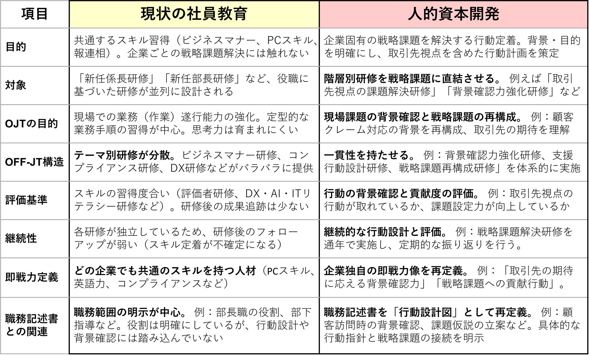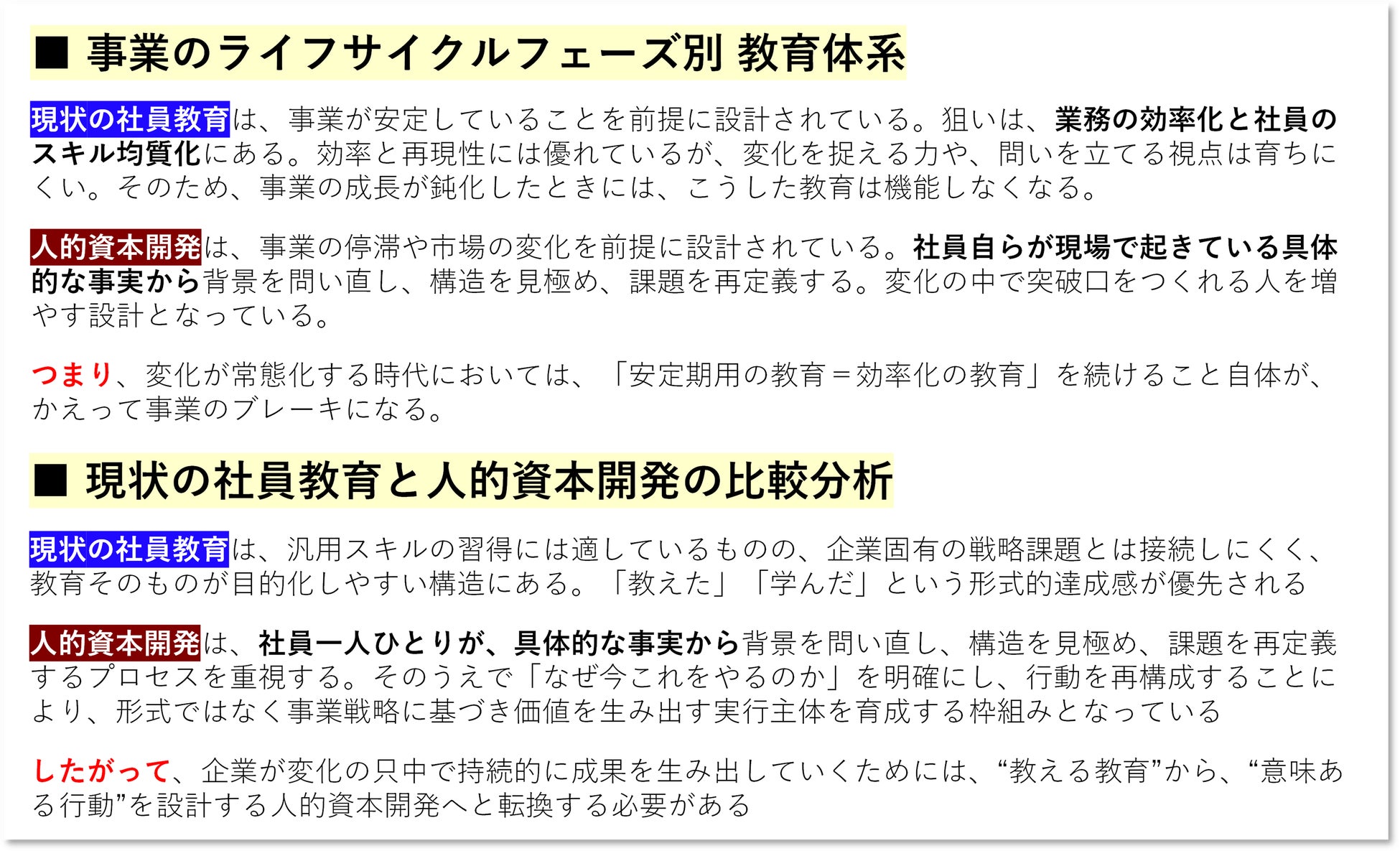 現状の社員教育が「事業安定期向け」の効率化・標準化に重きを置いているのに対し、人的資本開発は「市場変化・不安定期向け」の背景確認力や行動設計力の強化を目的としています。