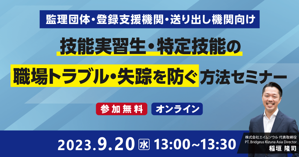 ≪9/20(水)開催≫ 監理団体・登録支援機関・送り出し機関向けWEBセミナー”技能実習生・特定技能の職場トラブル・失踪を防ぐ方法セミナー”