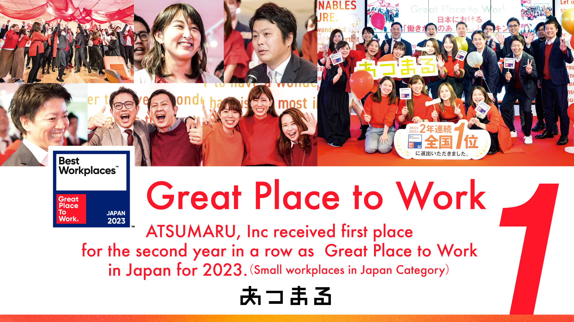 Atsumaru, Inc ranked first place for the second year in a row in Japan’s Great Place to Work contest in 2023. (Small workplaces in Japan category) Thanks to this award, there are an increasing number of inquiries from Japan and also all over the world.