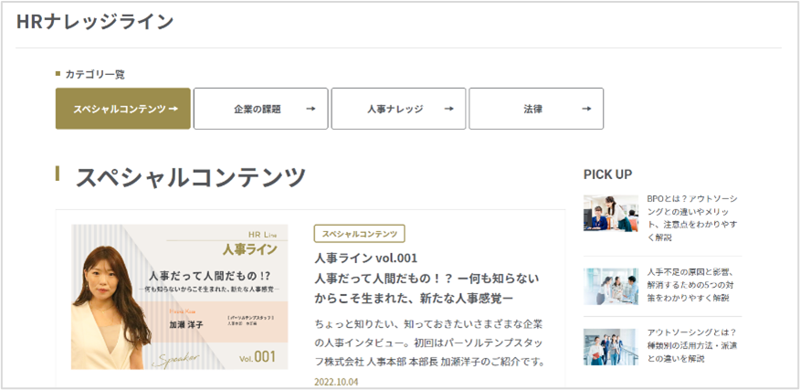 例えば「スペシャルコンテンツ」では、さまざまな企業の人事の方にインタビューし、他の会社の人事はどうしている?同じような悩みを抱えている?といった人事の皆さまの知りたい情報をはじめ、HRを取り巻くエキスパートへのインタビューやコラムも掲載。他にも「人事ナレッジ」としてアウトソーシングの活用方法やと派遣との違いについて詳しく解説しています。