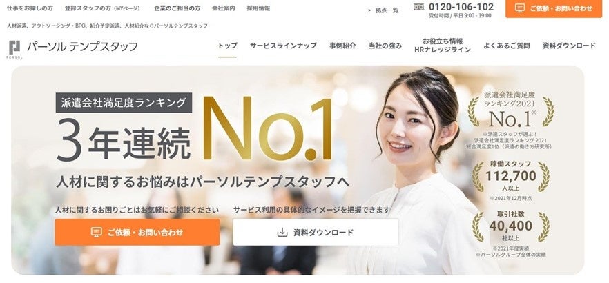 人材派遣サービスをはじめ、人材紹介・紹介予定派遣・アウトソーシング・BPOに加え、事務・オフィスワーク、コールセンター・ヘルプデスク、研究開発・臨床開発、軽作業など職種別のサービスラインナップをわかりやすく整理し、知りたい・欲しい情報にアクセスしやすくなりました。