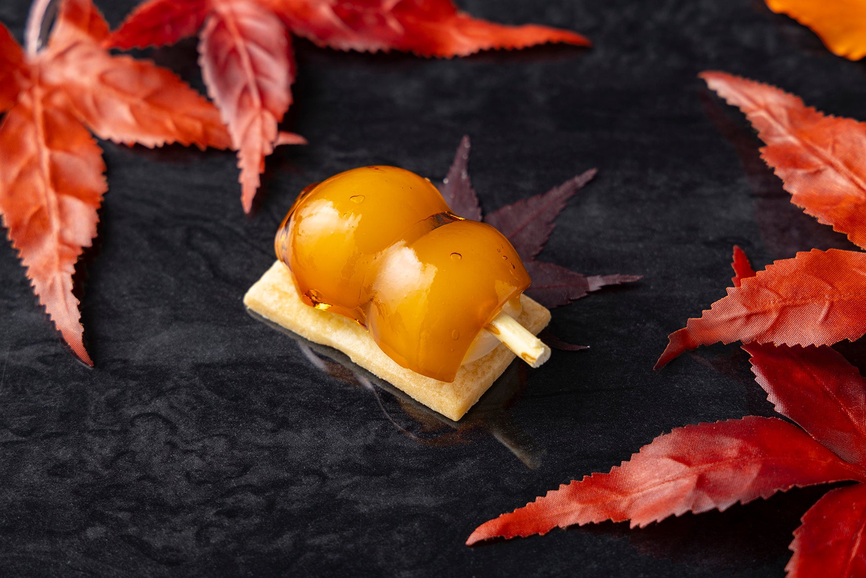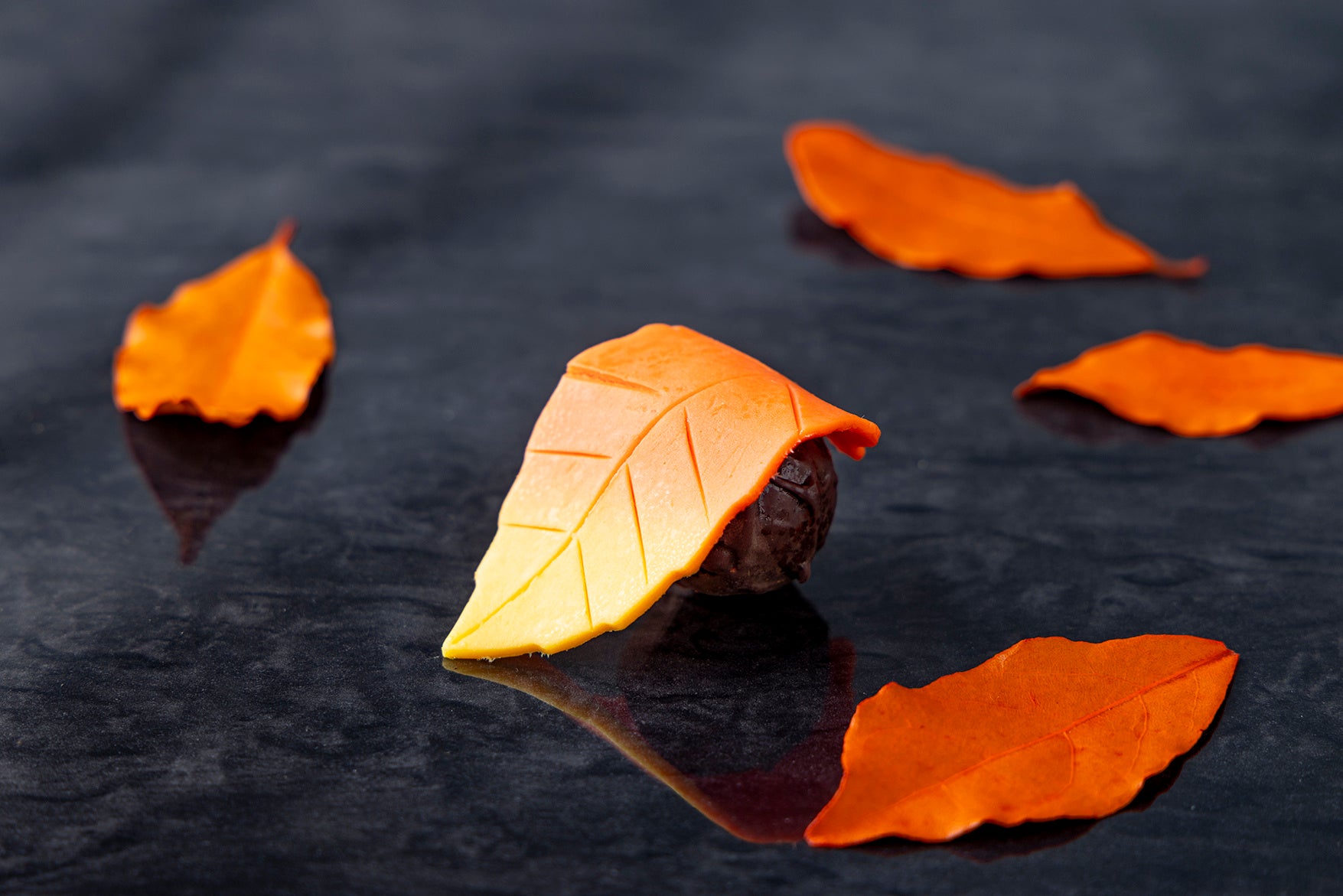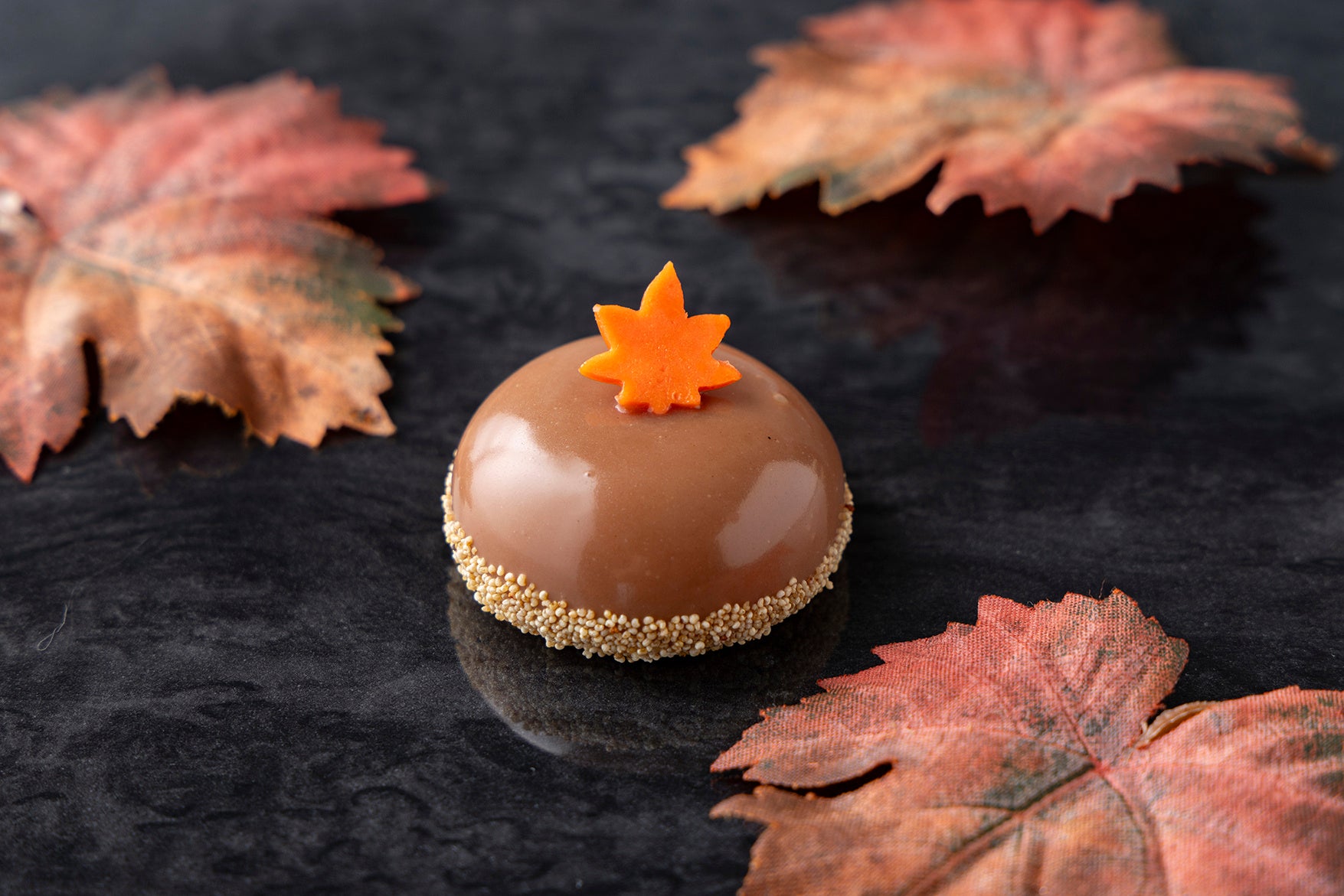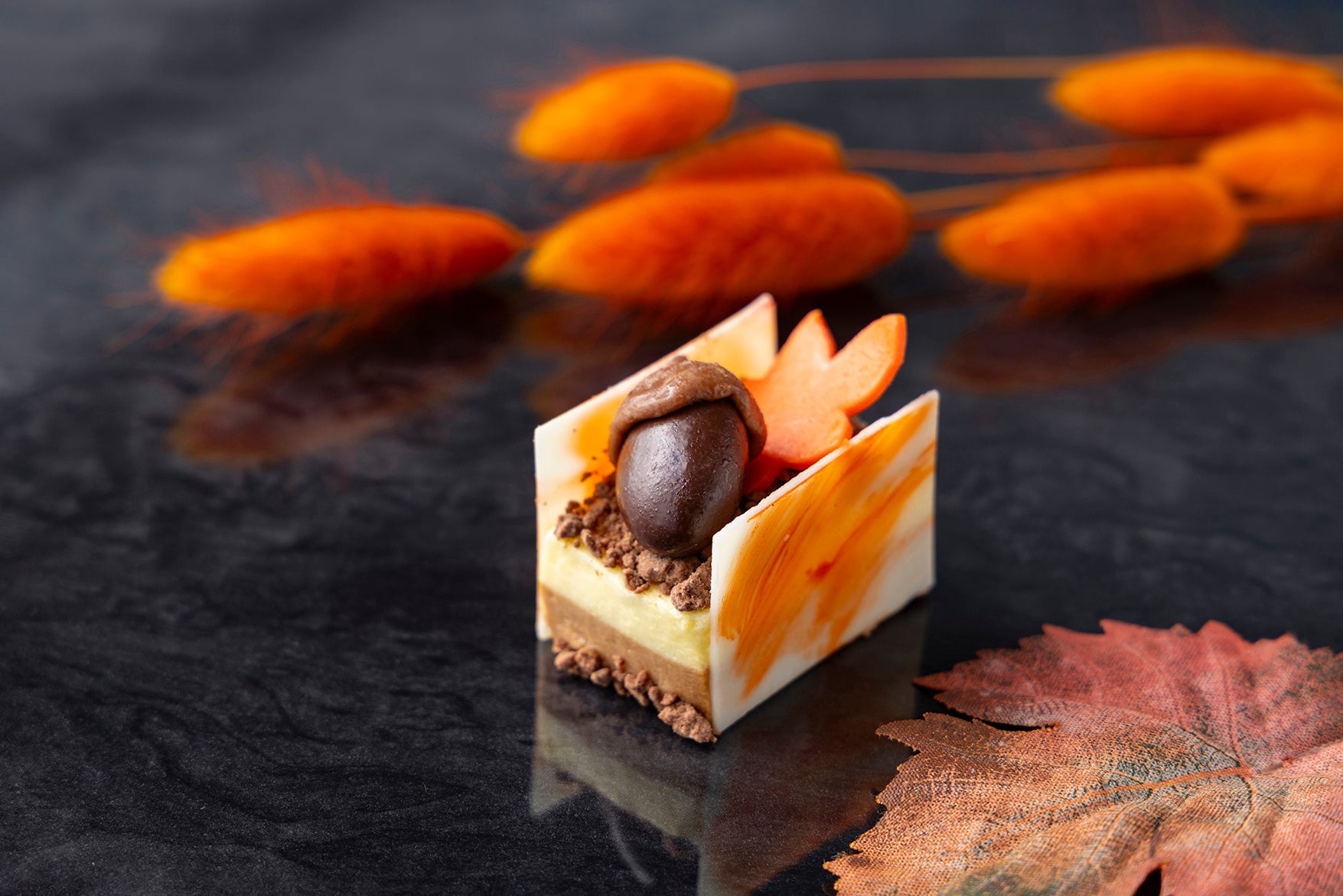 落ち葉に見立てたチョコで包んだトリュフフレーバーのボンボンショコラ。