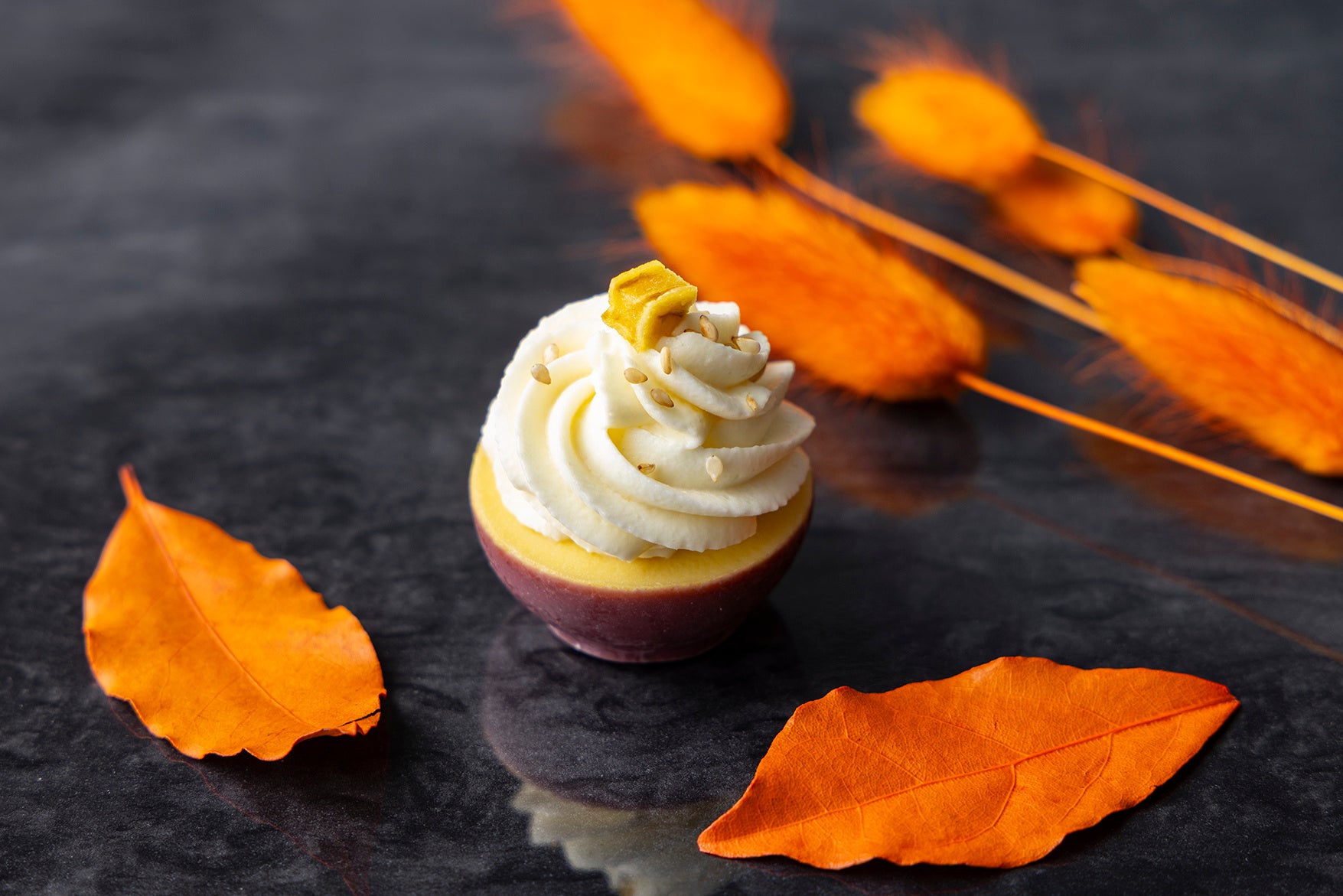 サツマイモのペーストを 入れたプディングに サツマイモクリーム。