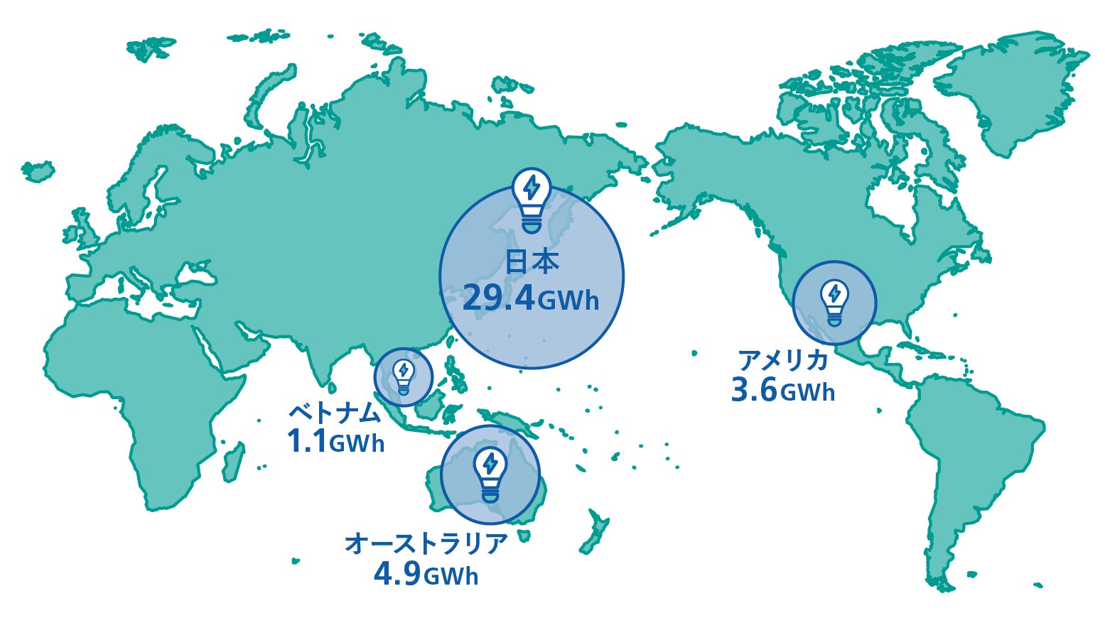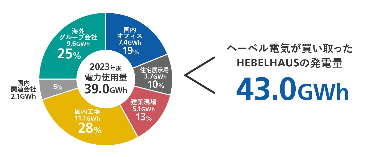 2023年度に海外を含む当社グループ全ての事業活動で使用した電力量は約39.0GWhでした。それに対し、「ヘーベル電気」による余剰電力買取量は、事業活動で使用した電力量を超える約43.0GWhとなり、当社はRE100を達成しました。2019年の参加時点での達成目標である2038年を大幅に前倒しした2023年度の「RE100」達成は、「へーベルハウス」「ヘーベルメゾン」を選んでくださり、余剰電力の販売先として「ヘーベル電気」をお選びいただいたオーナーの皆さまなくしては実現できませんでした。