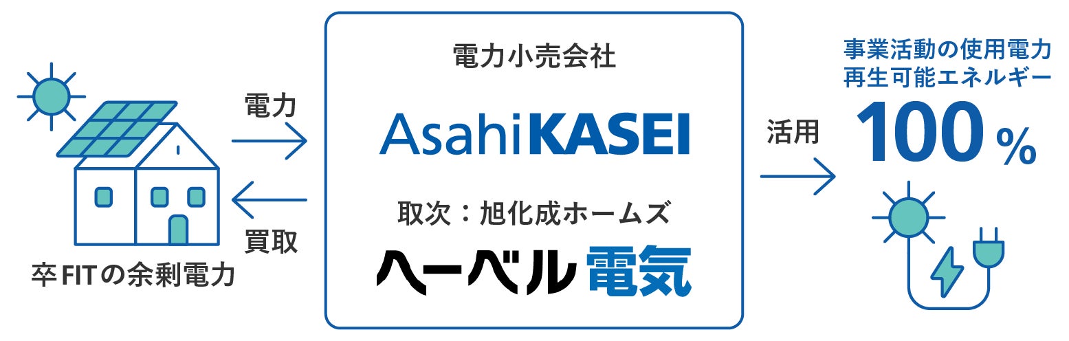 当社グループが設計・施工・維持管理等を行う戸建住宅「へーベルハウス」および賃貸住宅「ヘーベルメゾン」は、多くのオーナー様に太陽光発電設備を設置いただいております。それらの年間発電総量は「RE100」に参加した2019年9月時点で360GWh以上に達しており、それは2018年度の当社グループの事業活動で使った電力量約33GWhを優に超えていました。これらの太陽光発電設備は、国のFIT制度により設置から10年間は余剰電力の買取価格が保証されていますが、この期間を終了(=卒FIT)すると買取価格は大幅に下がります。当社の「ヘーベル電気」を通じて、この「卒FIT」の太陽光発電設備の余剰電力をオーナー様から買取り、「RE100」の達成に向けて活用しています。