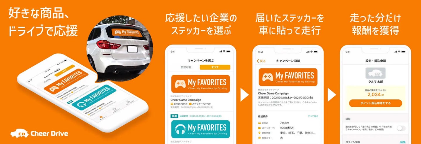 自分のクルマに、好きな商品やサービスのステッカーを貼って走行し、企業を応援することでポイントを得られるサービスです。