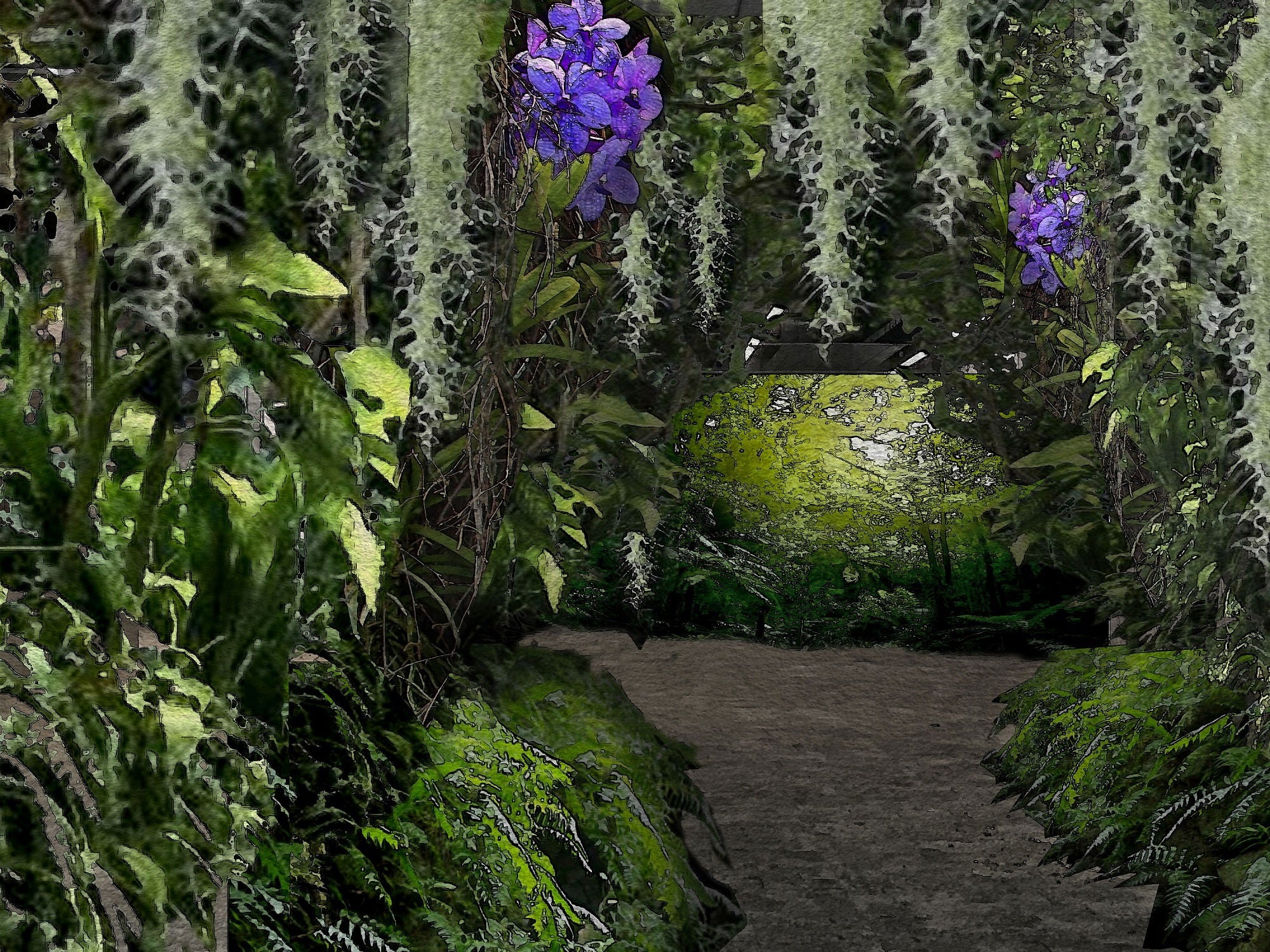 華やかならんの谷を抜けると、薄暗いうっそうとした植物が生い茂るコーナーに入ります。色濃い緑の中に展示された着生蘭や食中植物、エアープランツは、より一層神秘的な魅力を放ちます。