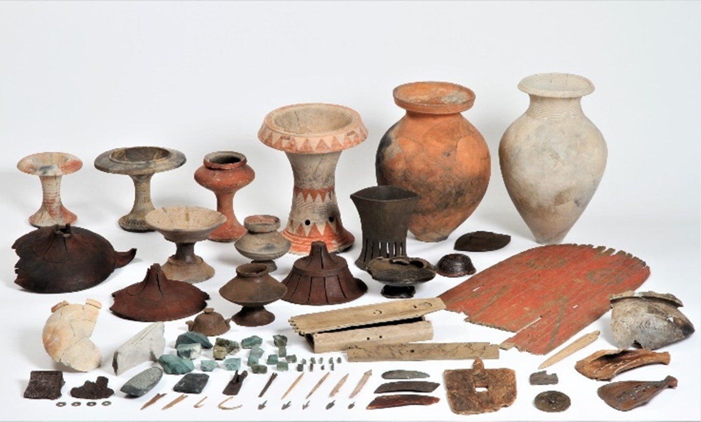 また、この遺跡に暮らしていた人びとの骨や脳、彼らが製作し、使用していた土器、石器、鉄器、木製の容器や農具、骨や角で作った漁具、美しい石やガラス製の装飾品など様々な道具が出土しており、全国屈指の量と質を誇ることから「地下の弥生博物館」とも呼ばれています。出土品のうち1,353点が国の重要文化財に指定されています。
