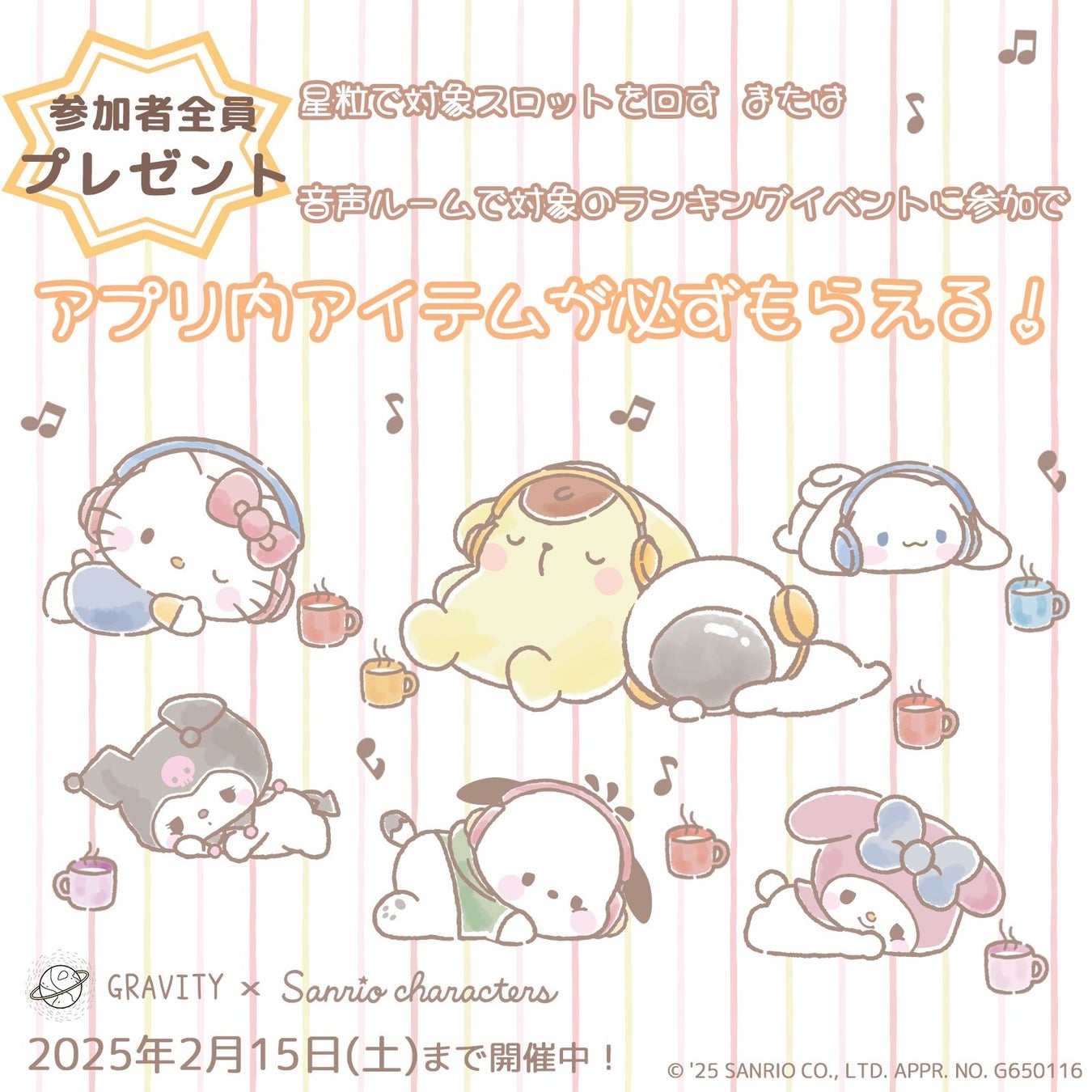 アプリ内でスロットを回したり、音声ルームのランキングイベントに参加すると、「サンリオキャラクターズ」のコラボアイテムが手に入ります。ここでしか手に入らない限定アイテムをゲットできるチャンスです。ぜひイベントに参加してお楽しみください!