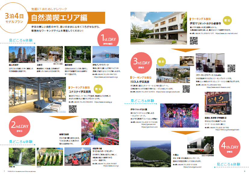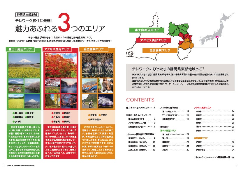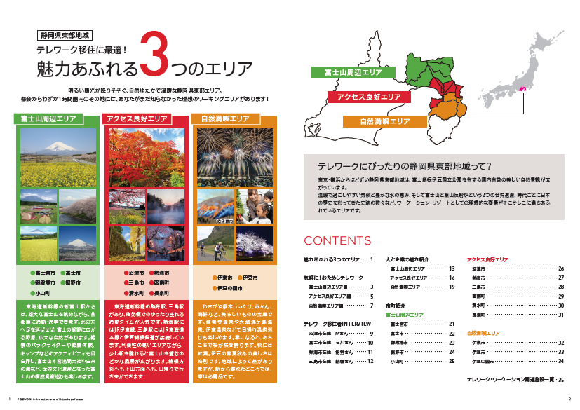 静岡県東部地域をあまり知らない方にもどんな地域かをイメージしやすいように、富士山周辺、アクセス良好、自然満喫の3つのエリアに分けて、ワーケーションの参考にしていただきたいモデルプランやテレワーク移住を考えている方に読んでいただきたい体験談をはじめ、地域の人や企業の魅力、おすすめスポットなど、テレワークやワーケーションに関心がある方におすすめの情報を掲載しています。