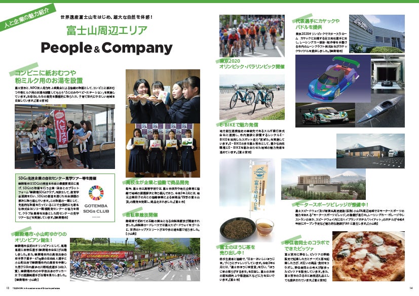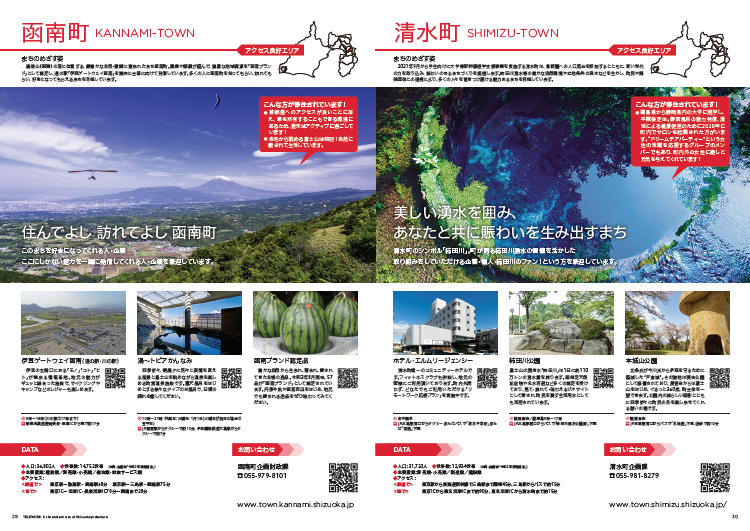 ガイドブックは、富士山のふもとから伊豆半島の入り口までの地域にある14の市町をあまり知らない方にもどんな地域かをイメージしやすいように、富士山周辺、アクセス良好、自然満喫の3つのエリアに分けて掲載しています。