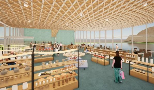 ショップやカフェ、展示室やVR施設などの紹介のほか、実際にカフェで提供されるメニューの展示や試食(11:00〜)も行います。