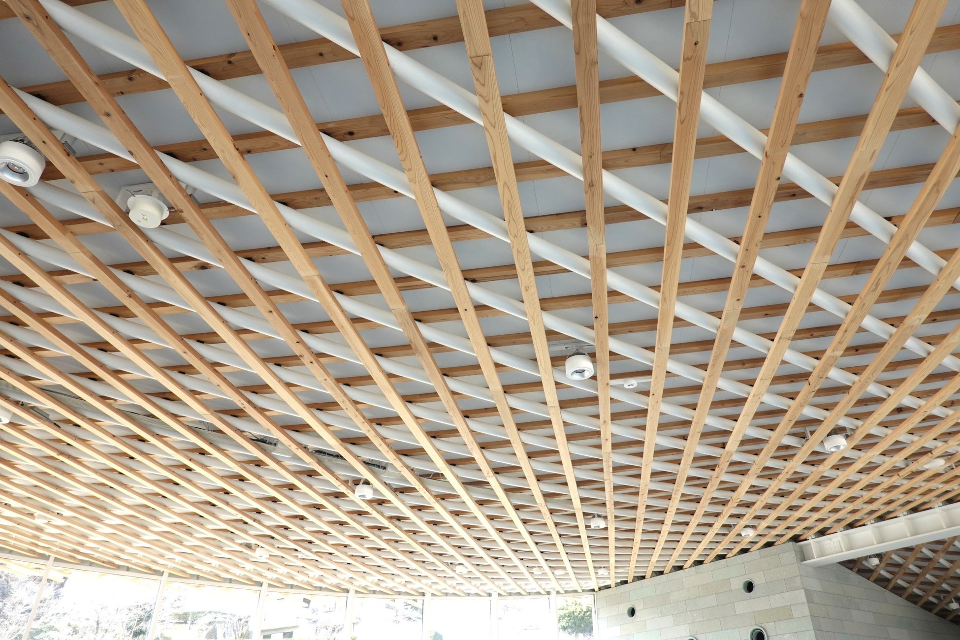 平屋建てとすることで周囲からの丸岡城の眺望を阻害せず、軽量化で地下の遺構への影響も最小限に。外壁には丸岡城の石瓦に使われたものと同じ素材の笏谷石を使うことで、景観との調和を図っています。また、天井を棒鋼で支える構造は非常に珍しい構造で、それにより柱と柱の間を広くできます。