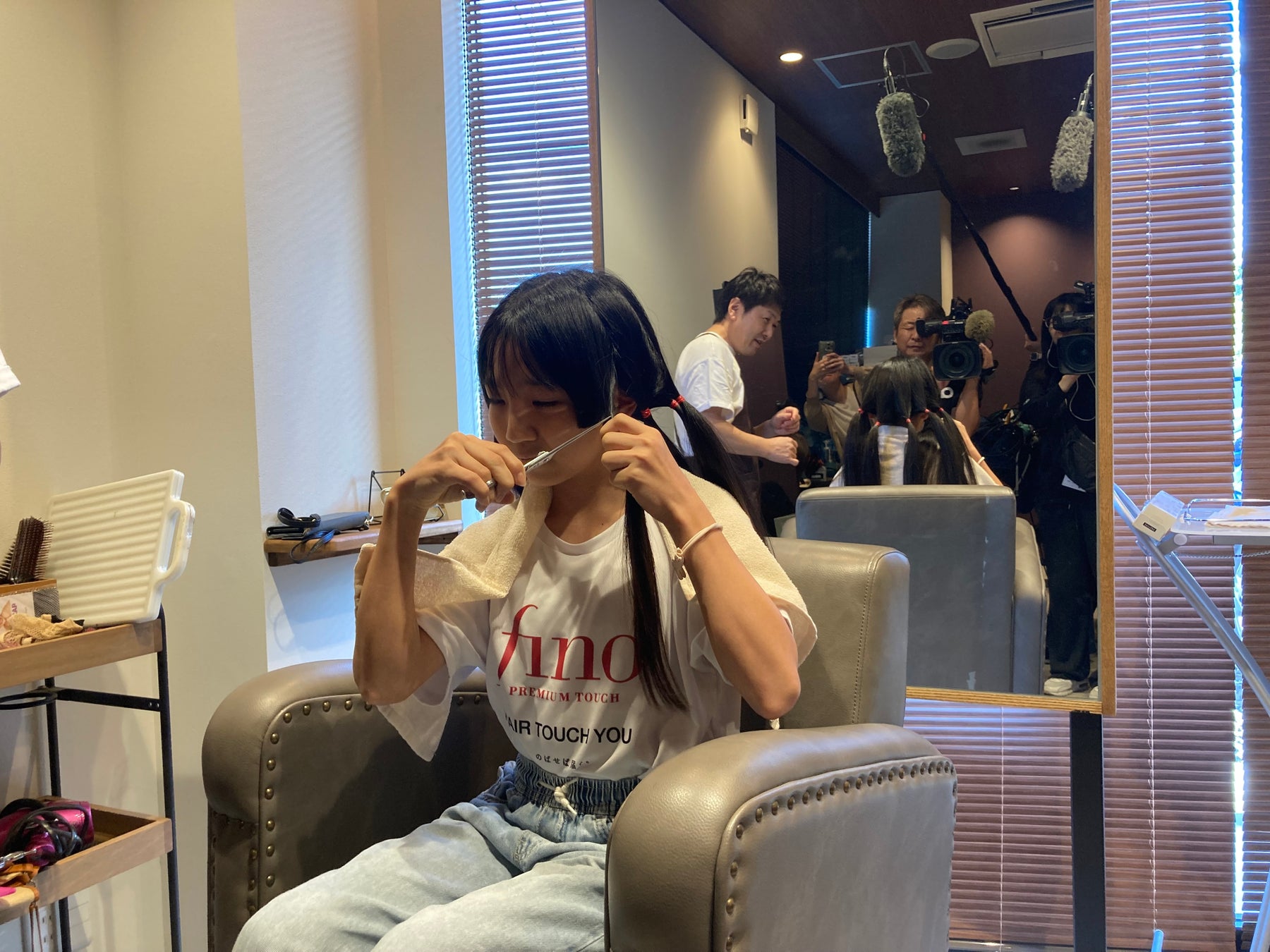 今回ドネーションカットにチャレンジしてくれたのは、中学2年生の戸枝果子さん。ヘアドネーションをするために伸ばしていたという彼女は、「いつできるかな?と思いながら伸ばしていたので、少し緊張もあるけれど、必要としている人のためになど役に立つのは嬉しい」と話し、31cm以上あった髪をカットしました。カットを担当したふくりび理事長の赤木勝幸さんは「伸ばすことは簡単なことじゃない、だからこそ、ヘアドネーションをする人にとっても、より素敵な体験にしてもらいたい。そしてそれが医療用ウィッグを必要としている方々への理解や他者を思いやる気持ちへと繋がると嬉しい」と、果子さんにハサミを渡し、ヘアドネーションをするご本人自らがファーストカットを行いました。参加した子どもたちの中には同じようにヘアドネーションをするために髪を伸ばしている方も多く、カットの様子に自分の姿を重ね合わせているようでした。