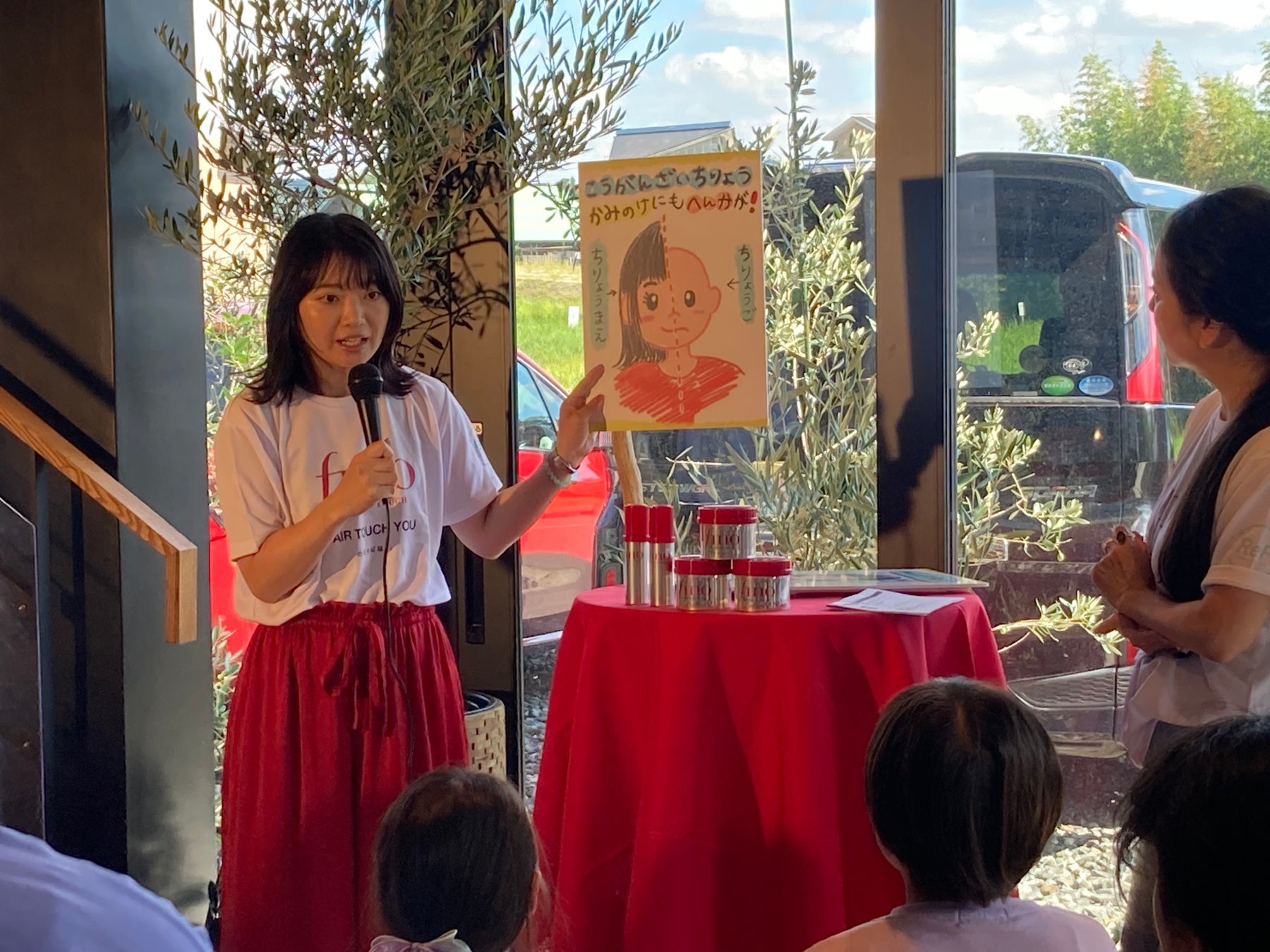 今回新たなコンテンツとして取り入れた、読み聞かせ。選んだのは、「ママのバレッタ」というお話です。長い髪の毛のお母さんはバレッタが大好きでしたが、抗がん剤治療が原因で髪の毛を失ってしまいました。バレッタを使えなくなったお母さんと、娘とのやりとりの中で、お互いを思いやり、受け入れていく様子が優しいタッチで描かれており、子どもたちは「その見た目には理由がある」ということも感じ取っていました。また、ご自身ががん闘病中に医療用ウィッグを使用していた矢方さんからは「大変なこともあるけど、医療用ウィッグを使う事で自分らしくいることができた。ヘアアレンジを楽しめたし、前向きな気持ちでいられた」という見た目の変化による気持ちへの影響や、「ヘアドネーションをしてくれる方がいるからこそ、必要としている人が選択肢を持つことができる」といった、ウィッグユーザーの視点から、遠い誰か、知らない誰かの出来事ではなく、身近に医療用ウィッグを必要としている人がいるという気づきを貰いました。