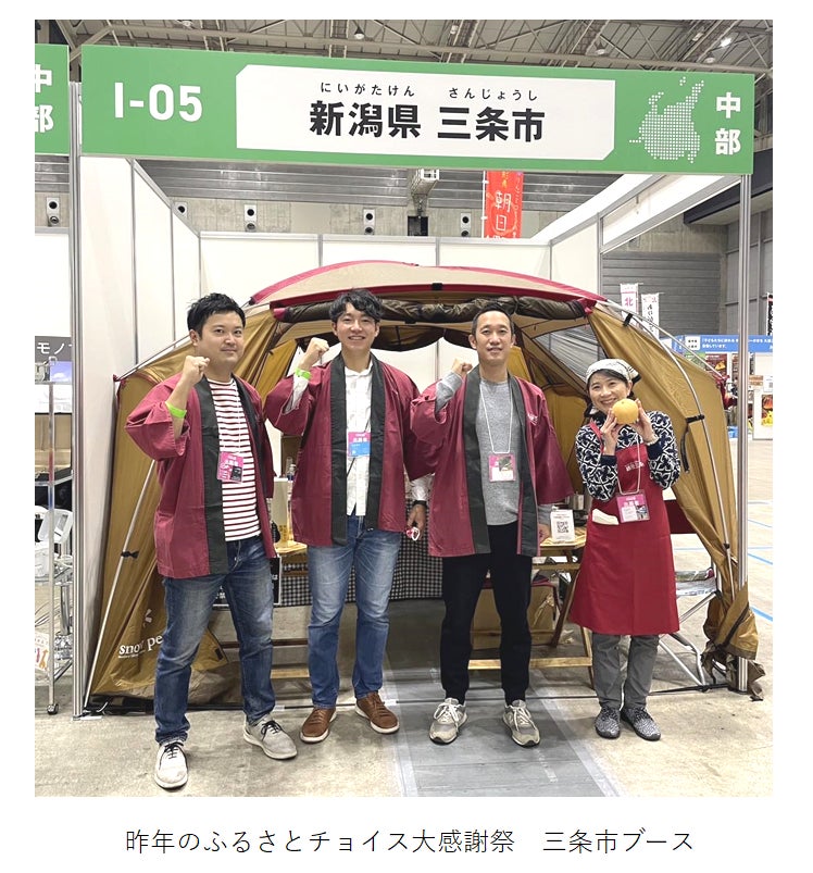 新潟県三条市(市長:滝沢 亮)は株式会社トラストバンク(代表取締役:川村 憲一)が主催する「第9回ふるさとチョイス大感謝祭2023」に出展し、三条市のふるさと納税返礼品のPRを行います。同イベントは11月11日(土)・12日(日)の2日間にわたってパシフィコ横浜にて開催され、100以上の自治体や生産者が寄付者の皆様と“交流”する日本最大級のふるさと納税イベントです。三条市が参加するのは昨年に続き、今年で2回目となります。
