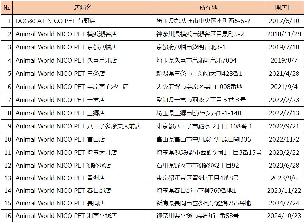 NICO PET湘南平塚店の出店により、全国のNICO PETは16店舗になります。