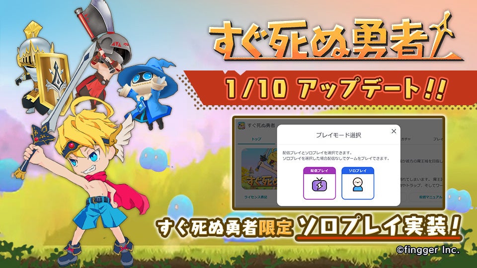 株式会社fingger(本社:東京都品川区、代表取締役:吉江直人)は、2023年1月10日(火)に、YouTube ライブで遊べる参加型ゲームプラットフォーム fingger(フィンガー)にて、コンテンツ『すぐ死ぬ勇者』にソロプレイが実装されたことをお知らせいたします。
