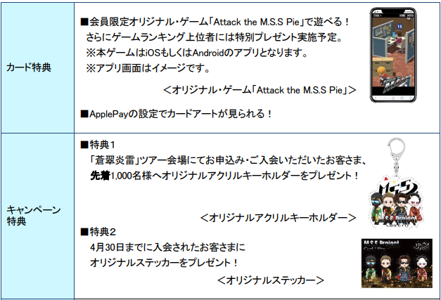 このたび、「M.S.S Project Tour 2023 『蒼翠炎雷』」の開催にあわせて、会員限定特典を多数取り揃えたクレジットカードの発行を開始いたします。カードご入会で会員限定オリジナルグッズがもらえるほか、「M.S.S Project」が登場するオリジナル・ゲーム「Attack the M.S.S Pie」がプレイできるなど、ファンにはたまらない会員限定特典やキャンペーンをご用意しています。