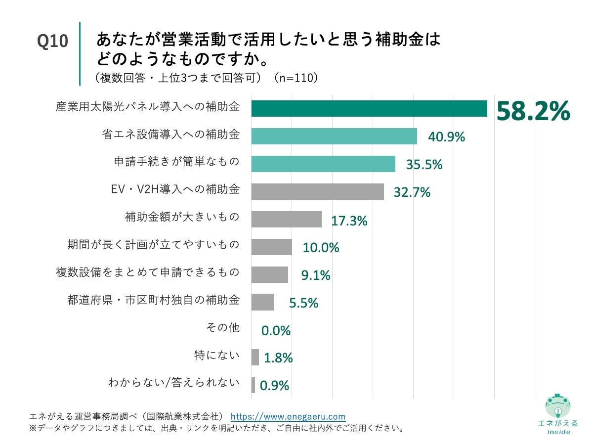 「Q10. あなたが営業活動で活用したいと思う補助金はどのようなものですか。(上位3つまで回答可)」(n=110)と質問したところ、「産業用太陽光パネル導入への補助金」が58.2%、「省エネ設備導入への補助金」が40.9%、「申請手続きが簡単なもの」が35.5%という回答になりました。