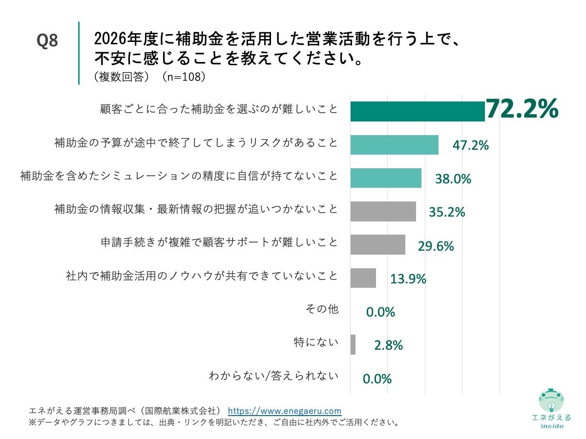 「Q8. Q4で「非常にそう思う」「ややそう思う」と回答した方にお聞きします。2026年度に補助金を活用した営業活動を行う上で、不安に感じることを教えてください。(複数回答)」(n=108)と質問したところ、「顧客ごとに合った補助金を選ぶのが難しいこと」が72.2%、「補助金の予算が途中で終了してしまうリスクがあること」が47.2%、「補助金を含めたシミュレーションの精度に自信が持てないこと」が38.0%という回答になりました。