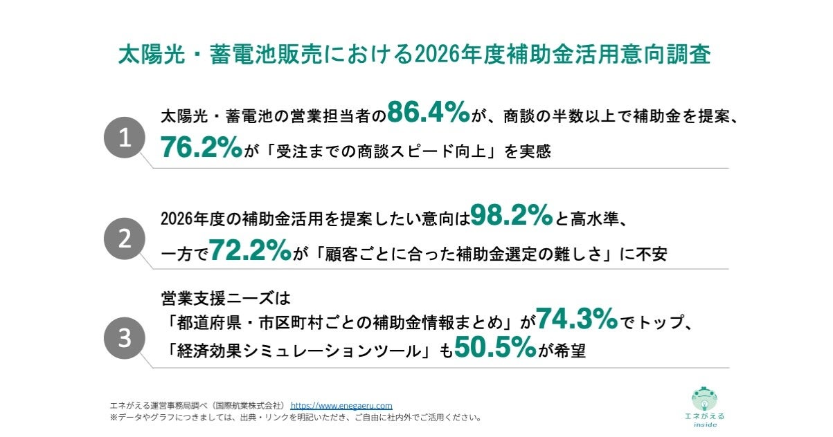 今回は、太陽光・蓄電池の販売施工店の営業担当者110名を対象に、太陽光・蓄電池販売における2026年度補助金活用意向調査を実施しました。その結果、86.4%が商談の半数以上で補助金を提案し商談スピード向上などの成果を実感している一方、72.2%が「顧客ごとに合った補助金選定の難しさ」に不安を抱えていることが明らかになりました。