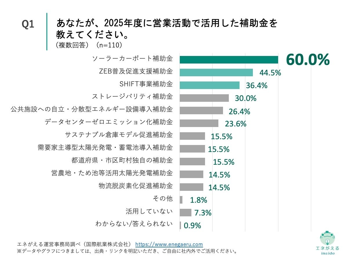 「Q1. あなたが、2025年度に営業活動で活用した補助金を教えてください。(複数回答)」(n=110)と質問したところ、「ソーラーカーポート補助金」が60.0%、「ZEB普及促進支援補助金」が44.5%、「SHIFT事業補助金」が36.4%という回答になりました。