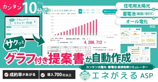 「エネがえる」のビジョンは”むずかしいエネルギー診断をかんたんにカエル”です。エネがえるは、住宅用から産業用まで太陽光パネル・蓄電システムやEV(電気自動車)・V2H(Vehicle to Home)販売に関わる営業担当者が、誰でもカンタンに需要家・施主向けの提案書を自動作成できる経済効果の試算ツールです。計算が難しい太陽光・蓄電システム、EV・V2Hの経済効果を誰でも専門知識なしにシミュレーションできるエネルギー診断特化型クラウドサービス(SaaS形式/API形式の2タイプ)として大手電力会社や有名太陽光・蓄電システムメーカー・国内TOPクラスの販売施工店まで全国700社以上に提供しています。